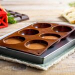 - Travasare la mousse in una sac à poche e distribuirla negli stampi a semisfera in silicone, riempiendo circa ¾ della loro capienza.