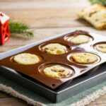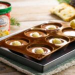 - Tagliare il panettone a fette dello spessore di circa 1/1,5 cm e con un coppa pasta tagliare dei dischetti della misura poco più piccola del fondo delle semisfere. Adagiare i dischetti di panettone sulla mousse, premendo leggermente per far arrivare la mousse all’estremità dello stampo. Riporre lo stampo in freezer e lasciare congelare per almeno 5 ore, oppure per tutta la notte.